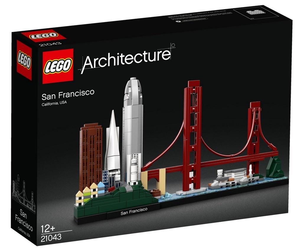 Zestaw przedstawia najbardziej znane atrakcje San Francisco, takie jak słynne wiktoriańskie domy zwane painted ladies, wieżowce 555 California Street, Transamerica Pyramid, Salesforce Tower oraz Coit Tower, Fort Point, most Golden Gate Bridge oraz wyspę Alcatraz.
