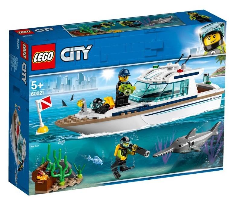 Zwiedź podwodny świat w zestawie LEGO(R) City 60221 Jacht! Ten luksusowy jacht do nurkowania ma zdejmowany dach, pokład do opalania, ruchomy reflektor i miejsce do spania lub przechowywania sprzętu w środku. Model uzupełnia fragment dna morskiego z wodorostami i otwieraną skrzynią skarbów, w której jest klejnot. W zestawie znajdziesz też boję, dwie minifigurki nurków LEGO oraz figurki miecznika i kraba.