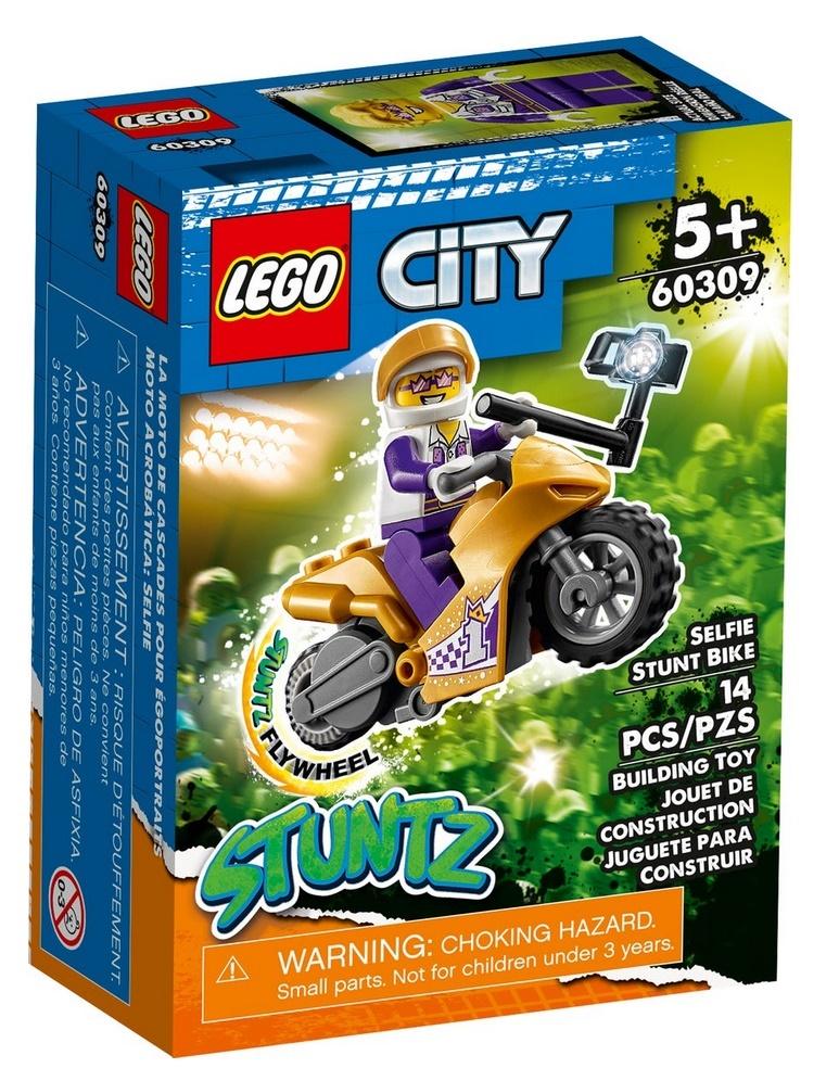- Zestaw LEGO(R) City Selfie na motocyklu kaskaderskim (60309) pozwoli wyobraźni dzieci wznieść się na wyżyny podczas zabawy motocyklem napędzanym kołem zamachowym oraz minifigurką ekstrawaganckiego Spotlighta z serialu telewizyjnego LEGO City.