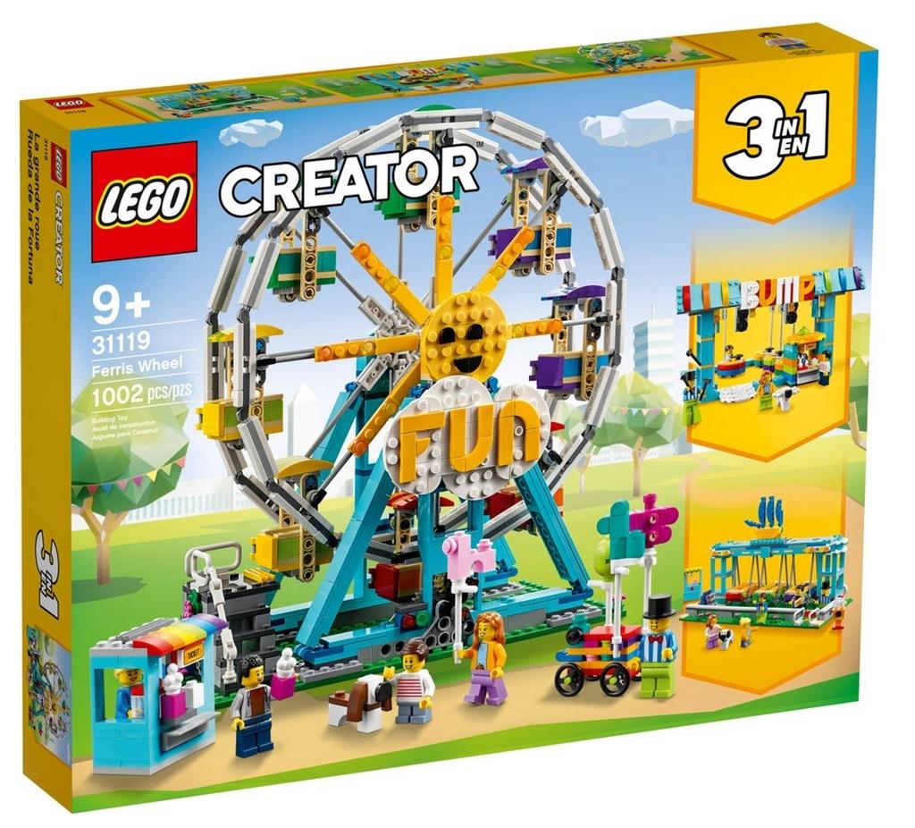o Zestaw LEGO(R) Creator 3 w 1 Diabelski młyn (31119) inspiruje dzieci do kreatywnej zabawy trzema modelami: diabelskim młynem, autkami i huśtawkami w kształcie łódek.o W tym zestawie LEGO(R) znajdziesz pięć minifigurek: mamę, tatę, dziecko oraz dwoje pracowników parku rozrywki. Pomogą one urozmaicić emocjonującą zabawę w wypad do lunaparku.o Obracający się diabelski młyn ma osiem wagoników dla minifigurek, a w komplecie jest też kasa biletowa, wózek z balonikami w kształcie zwierząt oraz zbudowany z klocków piesek.o Model z autkami zawiera trzy samochodziki i kasę biletową z mikrofonem, natomiast do modelu huśtawek dołączony jest automat z zabawkami oraz automat z gumą do żucia.o Ten zestaw LEGO(R) Creator 3 w 1 składa się aż z 1002 klocków i oferuje rodzicom i opiekunom niepowtarzalną okazję do wspólnej zabawy w budowanie z dziewięciolatkami i starszymi dziećmi.o Diabelski młyn ma ok. 27 cm wysokości, 16 cm głębokości i 26 cm szerokości, po skończonej zabawie będzie więc imponującą ozdobą dziecięcego pokoju.o Poznaj inne nowe zestawy z serii LEGO(R) Creator 3 w 1 na 2021 rok: Przygoda w promie kosmicznym (31117) i Średniowieczny zamek (31120).