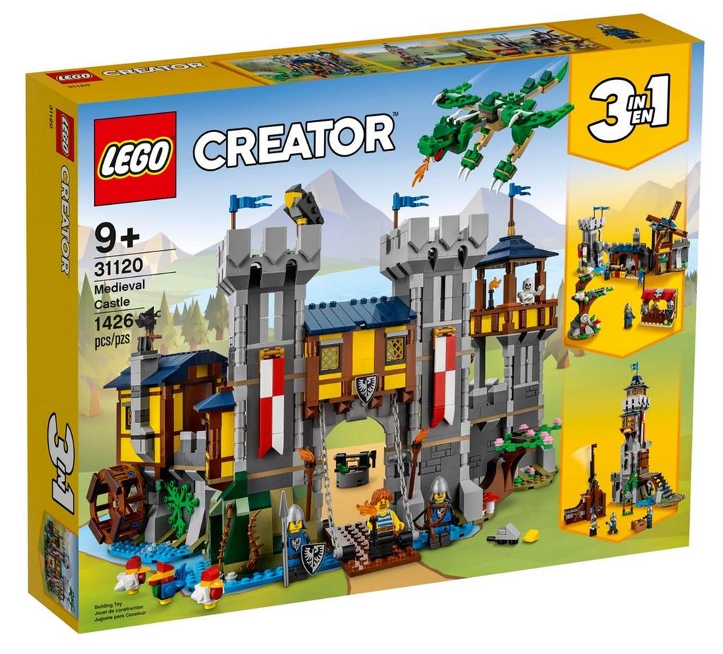 o Zestaw konstrukcyjny LEGO(R) Creator 3 w 1 Średniowieczny zamek (31120) oczaruje kreatywne dzieci trzema modelami w jednym pudełku -- do wyboru jest średniowieczny zamek, baszta i średniowieczny targ.o W zestawie znajdują się też trzy minifigurki, które urozmaicą nieustraszone zamkowe przygody dzieci: kowal i dwóch średniowiecznych strażników z imponującym uzbrojeniem.o Zamek ma dwie kondygnacje i zawiasy, dzięki którym rozkłada się z tyłu, umożliwiając zabawę na różne sposoby. Model wyposażony jest też w otwieraną bramę, kuźnię, młyn wodny, salę tronową i więzienie.o Do baszty dołączona jest działająca katapulta, a na średniowiecznym targu znajdziesz młyn wodny, wieżę strażniczą i więzienie.o Ten zestaw LEGO(R) Creator 3 w 1 z zamkiem liczy 1426 elementów i przyniesie mnóstwo satysfakcji z budowania wszystkim kreatywnym dziewięciolatkom i starszym dzieciom. To także świetny pomysł na prezent na urodziny lub pod choinkę.o Zabawkowy zamek dla dzieci ma ok. 26 cm wysokości, 31 cm szerokości i 28 cm głębokości -- w sam raz, żeby się nim bawić albo postawić na honorowym miejscu w pokoju.o Poznaj nowe zestawy z serii LEGO(R) Creator 3 w 1 na 2021 rok: Przygoda w promie kosmicznym (31117) i Diabelski młyn (31119).o Po zakupie trzech sztuk trzy różne modele można połączyć ze sobą.