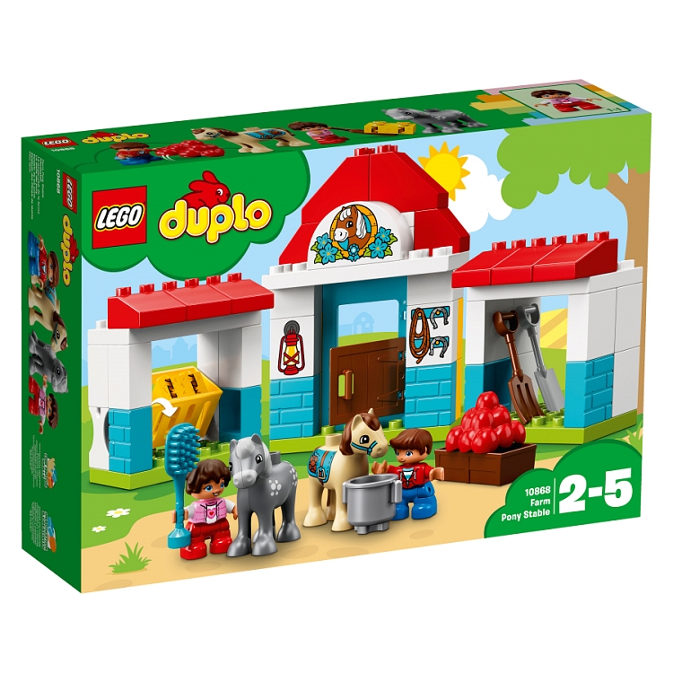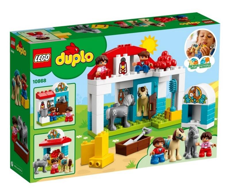 Zawiera dwie figurki dzieci LEGO DUPLO i dwie figurki kucyków. Stajnia ma otwierane drzwi i ruchomy paśnik.