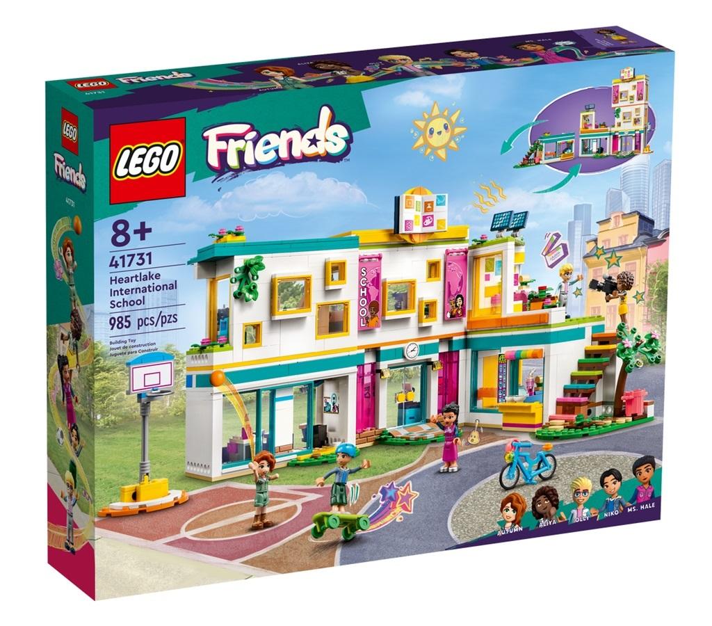 Dzięki zestawowi LEGO(R) Friends Międzynarodowa szkoła w Heartlake (41731)  dzieci w wieku od ośmiu lat będą poznawać nowe przedmioty i różne  kultury. Mogą zaglądać do sal, które są pełne akcesoriów szkolnych.  Modułowa budowa zestawu pozwala na przebudowywanie szkoły zgodnie z  własnymi zainteresowaniami. Jest tu stołówka, klasa przyrodnicza,  korytarz z szafkami, sala do plastyki, sala komputerowa i łazienka. Na  zewnątrz jest kosz do koszykówki, deskorolka i rower z kaskami. Dzieci  opiekują się klasowym chomikiem, Bunsenem, mogą puścić wodze fantazji w  sali do plastyki lub bawić się na skwerku - tu zawsze jest coś nowego do odkrycia.