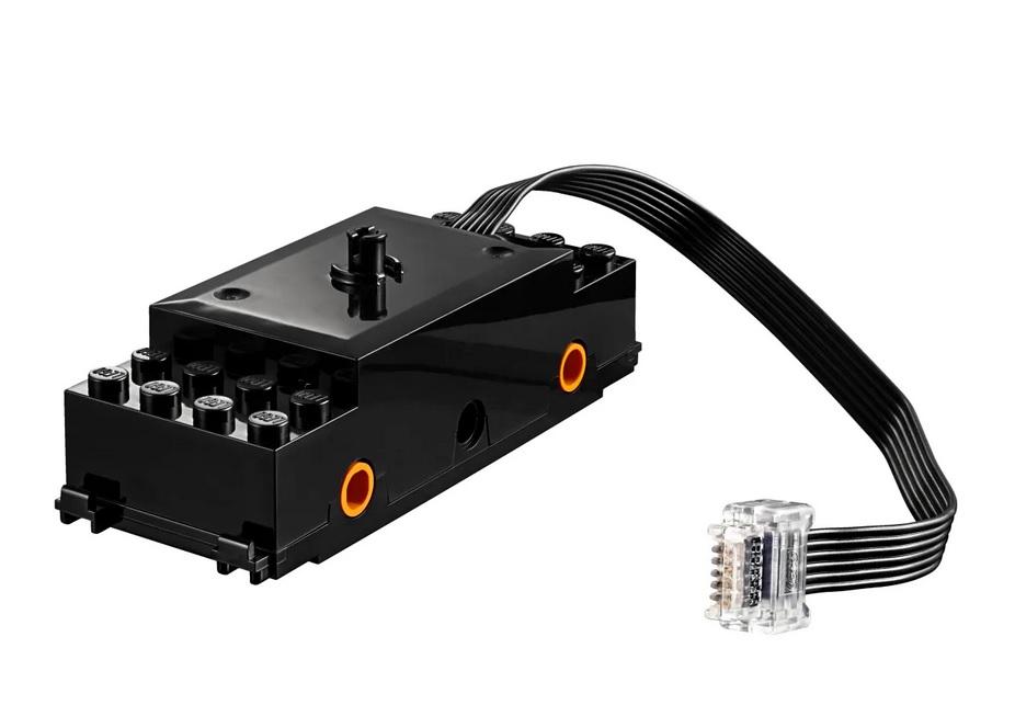 • Element ma dwa porty wejścia/wyjścia, dwa zintegrowane silniki położeniowe, zintegrowany czujnik przechyłu, przewód połączeniowy i złącze do elementów LEGO(R) Powered Up.