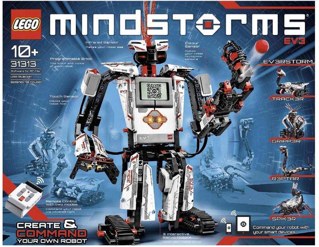 Nowy zestaw LEGO® MINDSTORMS® EV3! Dzięki uniwersalności systemu budowania LEGO i najbardziej zaawansowanej technologii połączonych w nowym zestawie LEGO MINDSTORMS EV3 możesz tworzyć niesamowite roboty i kazać im chodzić, rozmawiać, myśleć i robić wszystko, co tylko podpowie Ci wyobraźnia. Postępuj zgodnie ze szczegółowymi instrukcjami budowania w 3D, by stworzyć roboty znane jako TRACK3R, R3PTAR, SPIK3R, EV3RSTORM oraz GRIPP3R i tchnąć w nie życie za pomocą intuicyjnego interfejsu programowania opartego na ikonach. Sięgnij po dołączonego do zestawu pilota i weź udział w przygotowanych dla Ciebie pełnych wyzwań misjach lub pobierz darmową aplikację i wydawaj robotom polecania na swoim urządzeniu inteligentnym. Chcesz dzielić się swoimi pomysłami z innymi i czerpać od nich inspirację? Zaloguj się na LEGO.com/mindstorms, by uzyskać dostęp do mnóstwa ciekawych materiałów i komunikować się z ogromną społecznością fanów LEGO MINDSTORMS. Rozpoczęła się robotowa rewolucja LEGO MINDSTORMS EV3! Zabawka dla dzieci w wieku od 10 lat