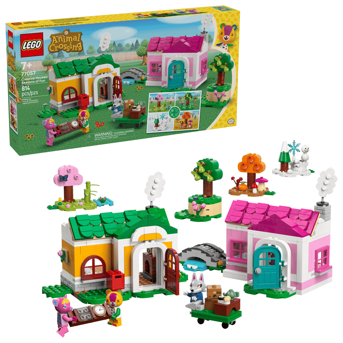 W zestawie są dwa domy do zbudowania i umeblowania, z wieloma akcesoriami i ozdobami zarówno wewnątrz, jak i na zewnątrz. Domki można ustawić obok siebie lub ustawić jeden na drugim jako dwupiętrowy budynek. Wymienne moduły dla każdej z czterech pór roku pozwalają dzieciom dodawać sezonowe akcesoria, takie jak śnieżki i bałwana, dynię i jesienne liście. Ten kreatywny zestaw zawiera trzy minifigurki: niedźwiedzia Stitchesa, jelenia Fuchsię i wilka Fanga. Wszystkie trzy postacie mają własne meble, a ruchomy wózek umożliwia zabawę w przeprowadzkę do nowego domu. Młodzi konstruktorzy mogą również cieszyć się cyfrową zabawą dzięki aplikacji LEGO(R) Builder, w której mogą powiększać i obracać modele w 3D. Zestaw zawiera 814 elementów.