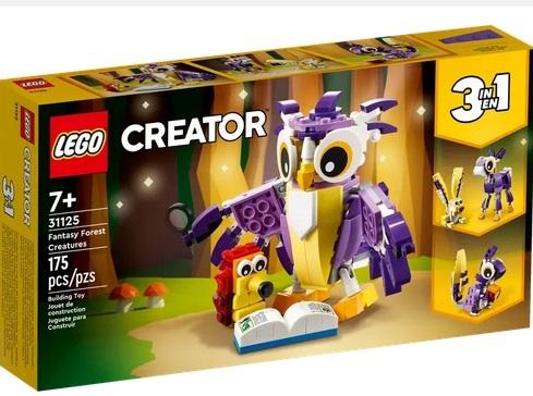 Zestaw LEGO(R) Creator 3 w 1 Fantastyczne leśne stworzenia (31125) pozwala dzieciom w wieku od siedmiu lat wymyślać magiczne historie z udziałem uroczych leśnych zwierząt. W komplecie jest mądra sowa z obrotową głową i ruchomym ogonem, nogami, skrzydłami oraz piórami. Ptak czyta książkę jeżykowi.