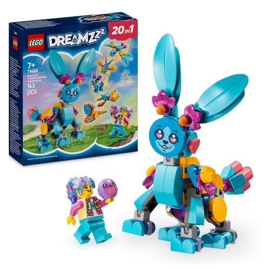 Kreatywność dzieci poszybuje do gwiazd, gdy zbudują uroczą figurkę króliczka Bunchu z ruchomymi nogami, rękami, stopami, ogonem i uszami, a następnie przebudują ją na 19 niesamowitych zwierzątek. Opcje budowania obejmują lwa, żółwia, jelenia, motyla, ważkę i nie tylko! Minifigurka Izzie, która ma nowy strój i pluszaka, ożywia zestaw i zachęca do kreatywnej zabawy w odgrywanie ról oraz wymyślania nowych przygód dla bohaterki LEGO DREAMZzz i jej króliczego pomocnika.