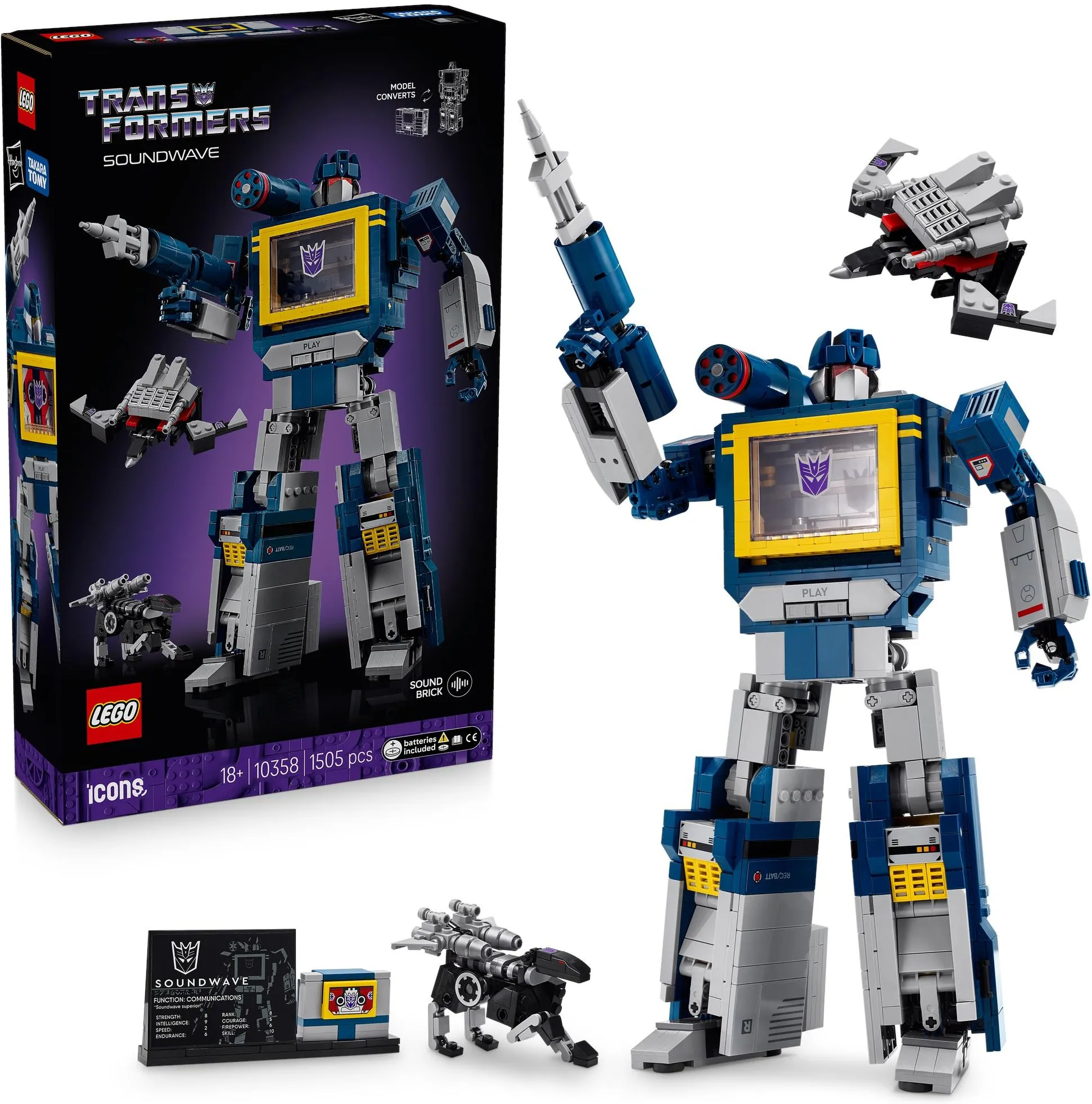 Figurka Transformersa ma ruchome kończyny i jest wyposażona w rakietę, miotacz laserowy i strzałki. Soundwavea LEGO możesz także z łatwością przekształcić w odtwarzacz kaset bez potrzeby rozkładania modelu. Naciśnięcie przycisku odtwarzania aktywuje efekty dźwiękowe i głosy postaci. Dodatkowo figurki akcji Ravagea i Laserbeaka do zbudowania z klocków zmieniają się w kasety i mieszczą się we wnęce Soundwavea. Całość uzupełnia tabliczka z parametrami mocy bohatera to ciekawa ozdoba na biurko, do salonu lub gabinetu.