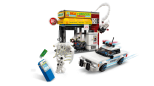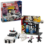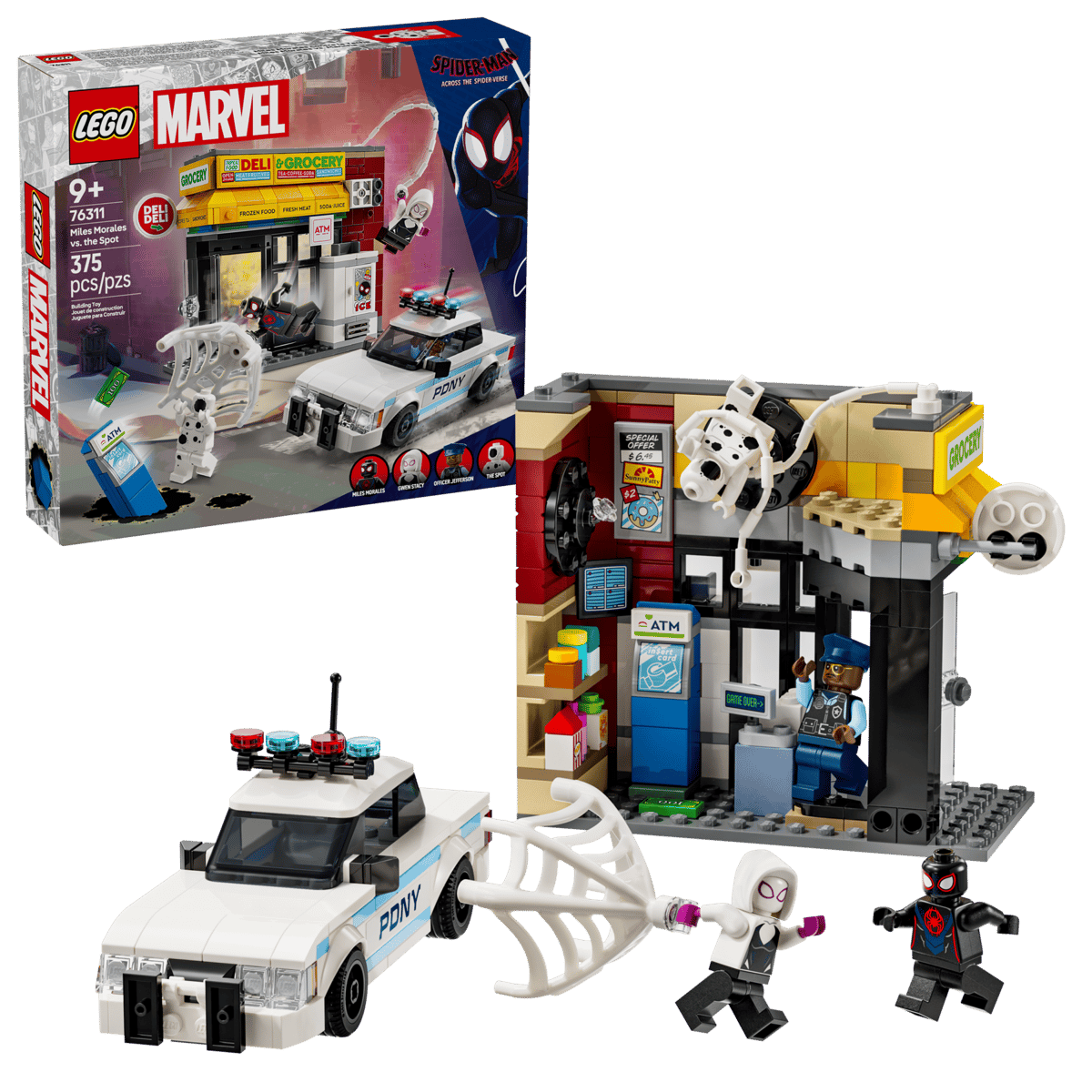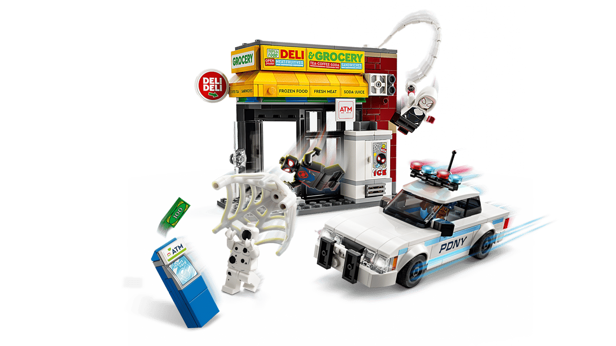 Zestaw zawiera cztery minifigurki: Milesa Moralesa, Spota, Gwen Stacy i oficera Jeffersona. Budynek sklepu ma funkcję wybuchającej ściany, która umożliwia wyciągnięcie bankomatu. Akcesoria obejmują długą, elastyczną linę pajęczą i elastyczną pajęczynę, w której zmieści się minifigurka. Radiowóz policyjny otwiera się, aby usadzić w nim dwie minifigurki. Dodatkową cyfrową zabawę zapewnia intuicyjna aplikacja LEGO Builder, w której konstruktorzy mogą powiększać i obracać modele w 3D oraz śledzić swoje postępy.