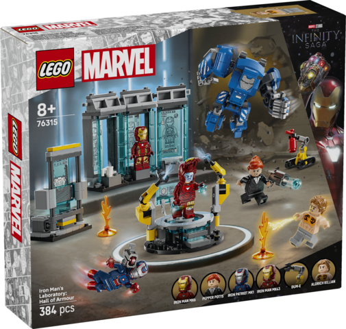 Zestaw LEGO Marvel zawiera trzy kapsuły ze zbrojami i trzy minifigurki zbroi Iron Mana: MK1, MK43 i MK6. Całość uzupełniają minifigurki Pepper Potts i złoczyńcy Aldricha Killiana, robota Dum-E i dużego mecha Igora MK3 z ruchomymi ramionami i nogami oraz kokpitem z miejscem na minifigurkę. Inne funkcje obejmują platformę serwisową z dwoma robotycznymi ramionami i dużymurządzeniem skanującym. Jest też gaśnica i dwa elementy imitujące ogień oraz dwa miotacze klocków do odgrywania bitew. Dodatkową cyfrową zabawę zapewnia intuicyjna aplikacja LEGO Builder, w której można powiększać modele, obracać je w 3D i śledzić swoj e postępy. Zestaw zawiera 379 elementów.