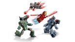 Zestaw przedstawia epicką scenę bitwy z filmu Iron Man 2 studia Marvel i zawiera minifigurki Iron Mana i War Machine oraz dwa składane drony Hammera. Drony Hammera są w pełni ruchome, dzięki czemu dzieci mogą ustawiać figurki w realistycznych, dynamicznych pozach. Zielony dron Hammera ma wyrzutnię sprężynową na ramieniu, a niebieski ma wyrzutnie na obu ramionach. War Machine ma czerwone blastery w dłoniach i stopach oraz miotacz klocków na ramieniu. Iron Man jest wyposażony w niebieskie blastery w dłoniach i stopach i może strzelać elementami imitującymi laserowe promienie. Dodatkową cyfrową zabawę oferuje intuicyjna aplikacja LEGO Builder, w której można powiększać, obracać modele w 3D i śledzić swoje postępy. Zestaw zawiera 204 elementy.