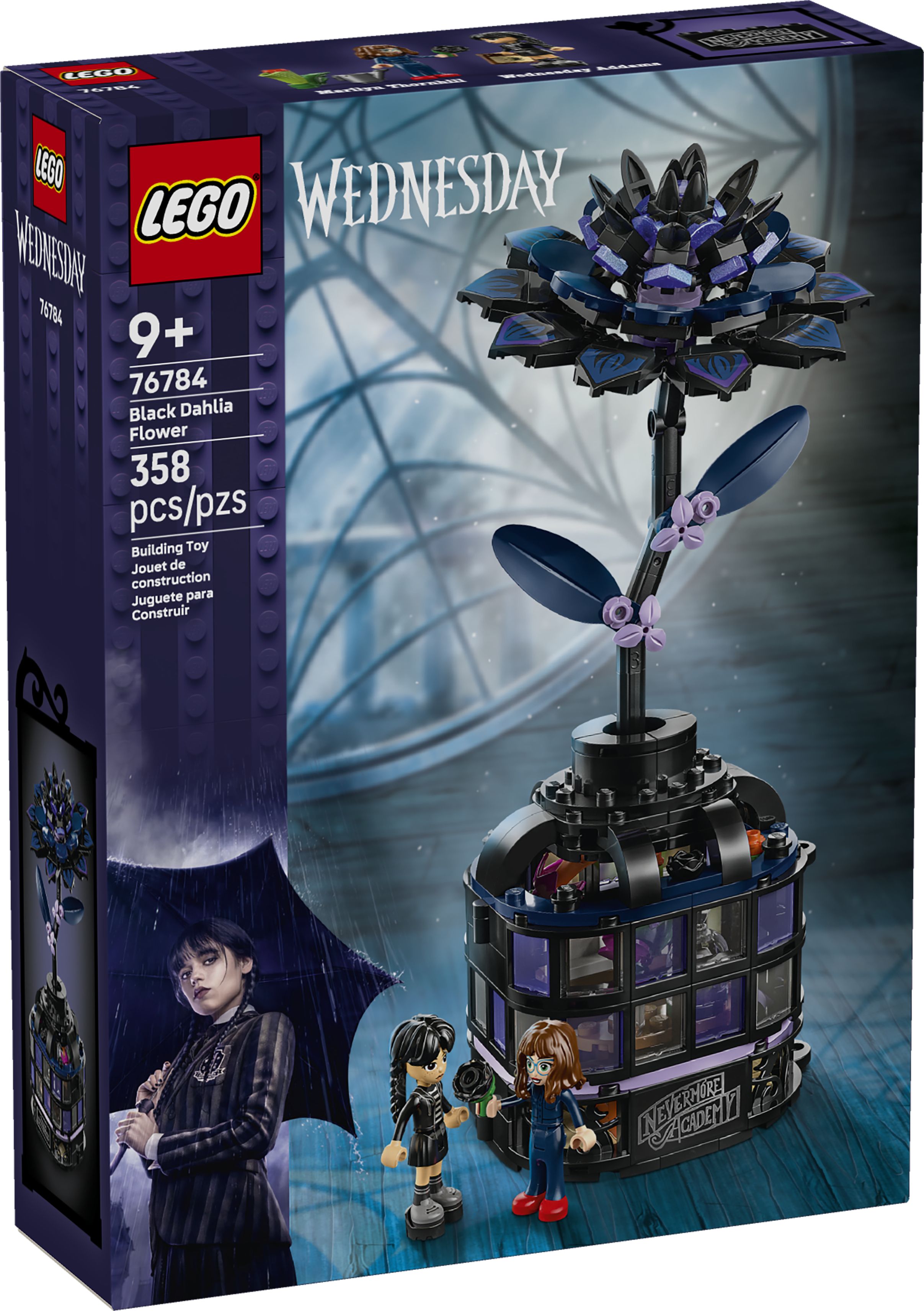 Elegancki zestaw LEGO(R) Wednesday Kwiat czarnej dalii (76784) jest idealny dla fanów botaniki i miłośników designu w wieku od dziewięciu lat. Ten ozdobny model zawiera czarną roślinę dalii z liśćmi i jasnofioletowymi pąkami oraz wazon przypominający miniaturową szklarnię. Po zbudowaniu dzieci wyjmują kwiat dalii, aby otworzyć wazon i odkryć klasę, w której znajdują się wyjmowane biurka, stołek i inne akcesoria do odgrywania historii. Zestaw zawiera również minilaleczki Wednesday Addams i profesor Marilyn Thornhill, które umożliwiają odgrywanie ról.