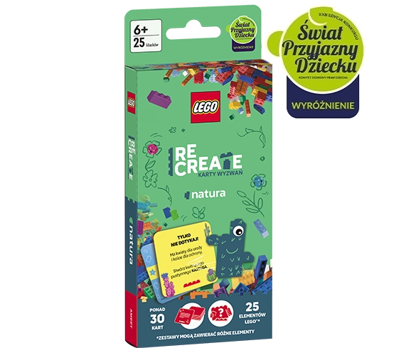 Uwielbiasz świat LEGO® i nie boisz się wyzwań? Ten zestaw jest właśnie dla ciebie! Losuj karty, dobieraj klocki i twórz niepowtarzalne modele związane z otaczającą cię naturą. Daj się ponieść swojej kreatywności! Grzyb z dużym kapeluszem albo chmura deszczowa, pustynny kaktus, a może flaming stojący na jednej nodze? To tylko niektóre z konstrukcyjnych zadań, jakie cię czekają w tej rozgrywce. Uwaga! Właśnie wkraczasz do świata nieskończonych możliwości budowania i przebudowywania! W zestawie znajdziesz 4 typy kart: karty TWÓRZ! inspirują do budowania, karty SPRAWDŹ SIĘ! wprowadzają kolejne konstrukcyjne wyzwania, karty ZMIENIAJ! dodają kontekst i zachęcają do przebudowywania, a karta BONUS nada zupełnie nowy wymiar zabawie! Karty Wyzwań świetnie się sprawdzą w podróży. Można się nimi bawić samemu lub z przyjaciółmi. Zestaw zawiera: 31 kart 25 klocków LEGO® W serii LEGO® Recreate. Karty Wyzwań znajdziemy także inne tytuły: Zwierzęta, Kosmos, Zamek, Przygody ninja, Przygoda w mieście, Ocean, Wynalazki, SUPERszkoła, Pupile, Urodziny. Wiek 6+