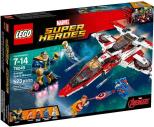 Avenjet z zestawu typu „2 w 1” pozwoli ci odtworzyć wspaniałe bitwy ze świata Marvel Super Heroes. Pojazd ma otwierane kokpity, 4 pociski, otwierany luk oraz odłączany miniodrzutowiec z 2 miotaczami. W zestawie 4 minifigurki: Kapitan Marvel, Kosmiczny Iron Man, Kosmiczny Kapitan Ameryka i Hyperion, a do tego duża figurka Thanosa. Zawiera 4 minifigurki: Kapitana Marvela, Kosmicznego Iron Mana, Kosmicznego Kapitana Amerykę i Hyperiona, a do tego dużą figurkę Thanosa. Avenjet to model typu „2 w 1”: ma otwierany główny kokpit, 4 pociski, otwierany luk i odłączany miniodrzutowiec z otwieranym kokpitem i 2 miotaczami klocków. W zestawie broń w postaci strzelających butów Thanosa do złożenia Akcesoria to między innymi silniki kosmicznegoIron Mana na stopy i ręce oraz urządzenie do oddychania, tarcza i plecak rakietowy Kosmicznego Kapitana Ameryki. Do zestawu dołączony jest także komiks. Wymiary Avenjeta: ok. 8 cm wysokości, 27 cm długości i 27 cm szerokości. Wymiary odłączanego miniodrzutowca: 4 cm wysokości, 11 cm długości i 20 cm szerokości. Wiek 7-14 lat