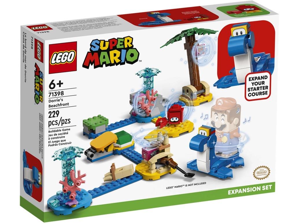 Pozwól sześciolatkom i starszym dzieciom rozbudować poziomy LEGO(R) Super Mario(TM) o kolorową plażę dzięki zestawowi rozszerzającemu Nabrzeże Dorrie  (71398). Zestaw zawiera figurkę LEGO Dorrie, na grzbiecie której mogą  usiąść figurki LEGO(R) Mario(TM) i LEGO(R) Luigi(TM) (figurki sprzedawane  oddzielnie). W komplecie jest też wyrzutnia do wystrzelenia zielonej  skorupy w figurkę Huckit Craba oraz zamek z piasku do zbudowania,  fontanna wodna i drzewo. Wszystkie elementy mają odlotowe funkcje, które gracz musi aktywować, aby znaleźć bloki z cyframi 1, 2 i 3. (Uwaga: do  interaktywnej zabawy wymagany jest zestaw startowy 71360 lub 71387).