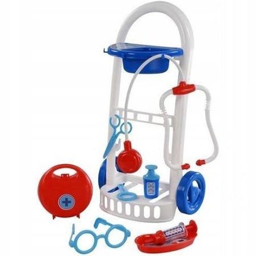 Zawartość wózka: plastikowy zamykany kuferek na akcesoria, stetoskop, nerka, nożyczki, okulary, strzykawka, lupa, menzurka na leki. Wiek: 5+