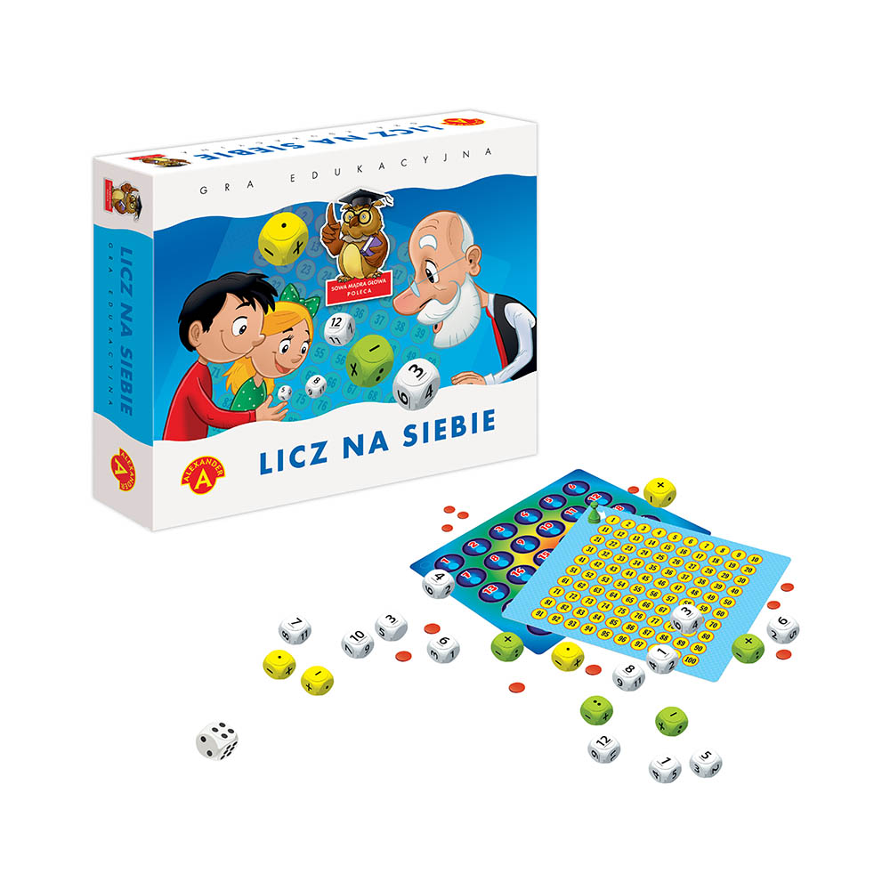 Kostki z liczbami 1÷6 - 8 sztuk. Kostki z liczbami 7÷12 - 4 sztuki. Żółta kostka działań ( +.-,o ) - 4 sztuki. Zielona kostka działań ( +.-,o ) - 4 sztuki. Plansza, Pionki - 5 sztuk. Kostka do gry (z oczkami). Żetony - 40 sztuk. Instrukcja.