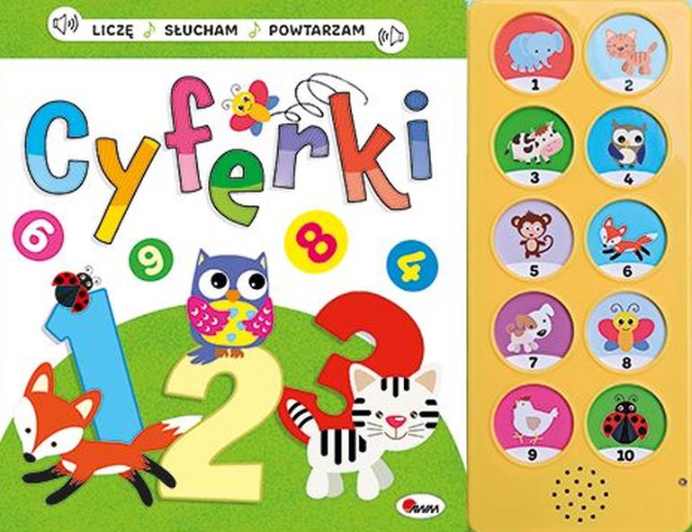 Książeczka sensoryczna – zawiera ELEMENTY DŹWIĘKOWE. Wspiera wszechstronny rozwój dziecka – pobudza ZMYSŁY WZROKU, DOTYKU I SŁUCHU. Prezentuje 10 DŹWIĘKÓW. Zawiera proste krótkie WIERSZYKI o zwierzętach. Książka zabiera małych czytelników do KRAINY CYFEREK. Dzieci znajdą w niej krótkie WIERSZYKI o zwierzątkach, a także zabawy z LICZENIEM. Wyróżnikiem publikacji jest 10 DŹWIĘKÓW odpowiadających cyferkom, wydawanych po naciśnięciu PRZYCISKÓW DŹWIĘKOWYCH. Dzięki niej maluch pozna cyferki, nauczy się je rozróżniać i powtarzać ich nazwy, a także pozna zwierzątka. Sympatyczne ILUSTRACJE charakteryzują się ŻYWĄ KOLORYSTYKĄ. Książka • działa na RÓŻNE ZMYSŁY: WZROK, DOTYK, SŁUCH • zapoznaje z cyferkami i uczy prostego liczenia • rozwija WYOBRAŹNIĘ • wzbogaca SŁOWNICTWO
