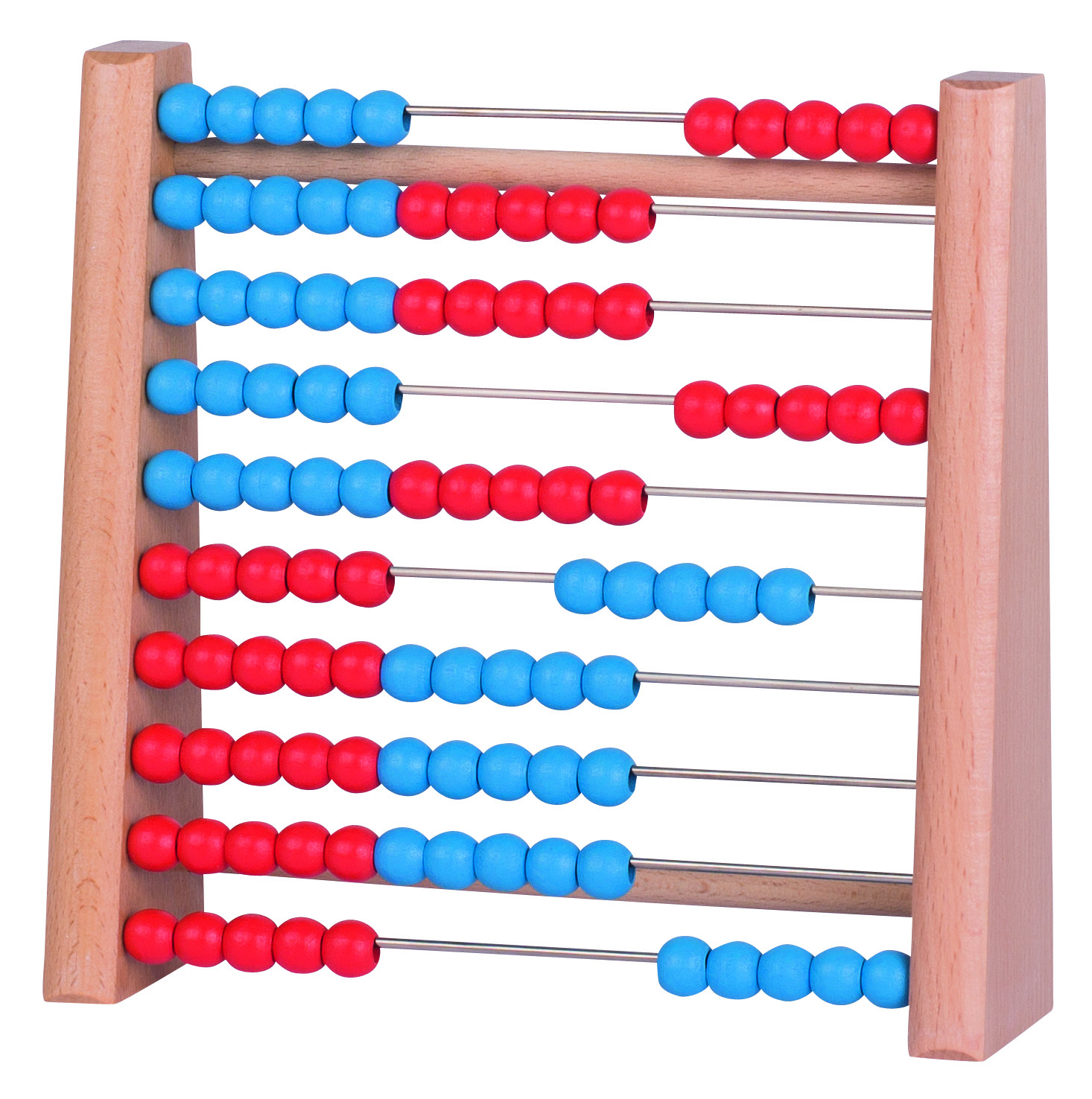 Liczydło drewniane z metalowymi prętami. 100 kulek w dwóch kolorach: czerwony i niebieski.