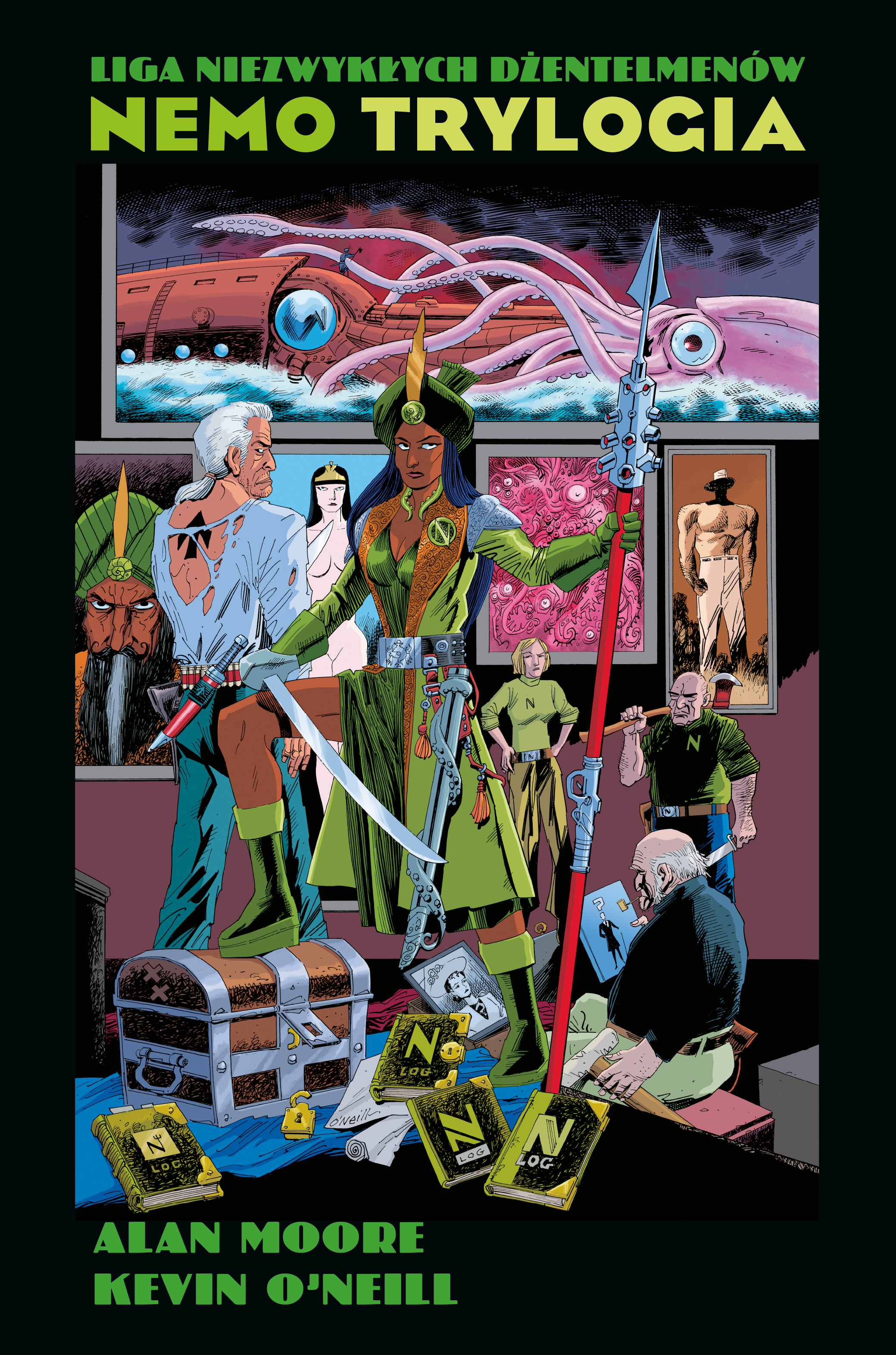 "Nemo. Trylogia" to zbiorcze wydanie trzech opowieści znakomitego duetu autorskiego, Alana Moore'a i Kevina O'Neilla, którzy brawurowo przedstawiają przygody córki legendarnego kapitana Nemo, członka Ligi Niezwykłych Dżentelmenów. Janni Dakkar znana jest przede wszystkim jako dziedziczka spuścizny swojego ojca i nowa kapitan "Nautilusa", okrętu siejącego postrach wśród ludzi morza. W opowieściach zebranych w tym tomie poznajemy bohaterkę na przestrzeni wielu lat. W pierwszej z nich, zatytułowanej "Serce z lodu", przemierzymy z księżniczką Antarktydę śladami ostatniej wyprawy jej ojca. Trafimy w okolice, o których pisali Edgar Allan Poe ("Opowieść Artura Gordona Pyma z Nantucket") oraz Howard Phillips Lovecraft ("W Górach Szaleństwa"). W "Berlińskich różach" akcja przenosi się do roku 1941. Janni wraz z mężem Jackiem Strzałą spieszą na ratunek córce i trafiają w samo serce Rzeszy. W upiornej metropolii czekają na nich nie tylko wojska wroga, ale także pozostałości niesławnych Bohaterów Zmierzchu, niemieckiej odpowiedzi na Ligę Niezwykłych Dżentelmenów. Ostatni rozdział trylogii, noszący tytuł "Rzeka duchów", ukazuje osiemdziesięcioletnią Janni Nemo w roku 1975. Bohaterka wyrusza "Nautilusem" na swoją ostatnią wyprawę w górę Amazonki, aby jeszcze raz zmierzyć się z dawnym wrogiem. Czy jednak ów cień z przeszłości istnieje naprawdę, czy to tylko jeden z duchów towarzyszących starej kapitan? Scenarzystą serii jest słynny brytyjski twórca Alan Moore, autor takich bestsellerów jak "Strażnicy", "Promethea", "V jak vendetta", "Providence". Rysunki są dziełem stałego grafika cyklu, Kevina O'Neilla ("Nemezis the Warlock", "Marshal Law"), zdobywcy wielu wyróżnień komiksowych, w tym dwóch Nagród Eisnera. Lektura trylogii nie wymaga dokładnej znajomości fabuły "Ligi Niezwykłych Dżentelmenów". Album zawiera materiały wydane pierwotnie jako "Nemo: Heart of Ice", "Nemo: Roses of Berlin" i "Nemo: River of Ghosts". Komiks dla dorosłych.