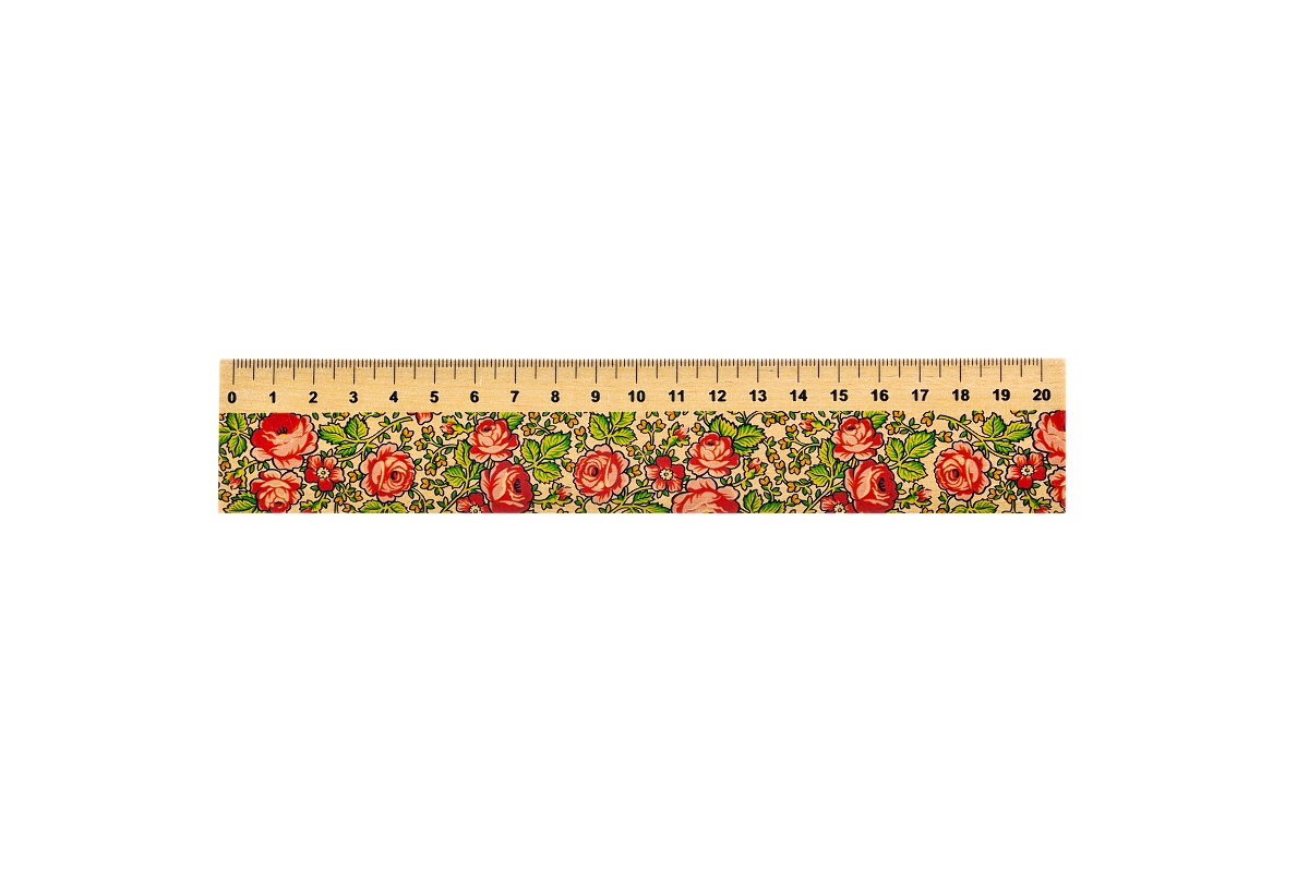 Drewniana linijka folk 20 cm z góralskimi motywami ludowymi na naturalnym tle