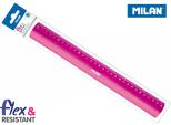 Linijka MILAN 30 cm. Przezroczysta w kolorze różowym. Wykonana z elastycznego i trwałego materiału (Flex&Resistant), co utrudnia jej złamanie. Skośna krawędź zapobiega zabrudzeniom.