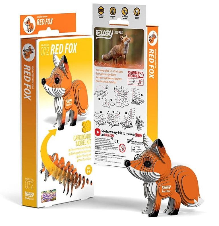 Eugy zaprojektowane w Nowej Zelandii są wykonane z przyjaznego dla środowiska kartonu pochodzącego z recyklingu i farby na bazie ryżu. Zestaw zawiera ponumerowane elementy układanki, nietoksyczny klej oraz instrukcję do zbudowania lisa. Zbierz całą serię zwierząt, ptaków, dinozaurów i wiele innych. Dla dzieci w wieku 6 lat +. Rude lisy to oszałamiające stworzenia, które słyną z przebiegłości i siły. Żyją samotnie i opuszczają gniazdo rodziców w wieku zaledwie siedmiu miesięcy! Lisy dobrze zaadaptowały się w różnych środowiskach, od Arktyki, przez lasy, po tereny miejskie. Lisi puszysty ogon pomaga im utrzymać ciepłotę i może być także używany jako narzędzie komunikacji. Lis Eugy Eko Układanka 3D: Eko układanka 3D do samodzielnego złożenia lisa. Wykonana z kartonu. Rudy lisek z dużą rudą kitą. Zawiera ponumerowane elementy oraz nietoksyczny klej. Rozwija wyobraźnię, planowanie, motorykę. Zestaw zawiera instrukcję do złożenia lisa. Dla dzieci w wieku 6 lat +.