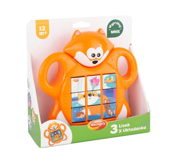 Uroczy lisek kryje w swym brzuszku obrotowe klocki, z których możesz ułożyć aż 3 różne obrazki. Zabawie towarzyszy 8 dźwięków i 2 wesołe melodie. Praktyczne otwory, ułatwiają małym rączkom chwytanie zabawki.
