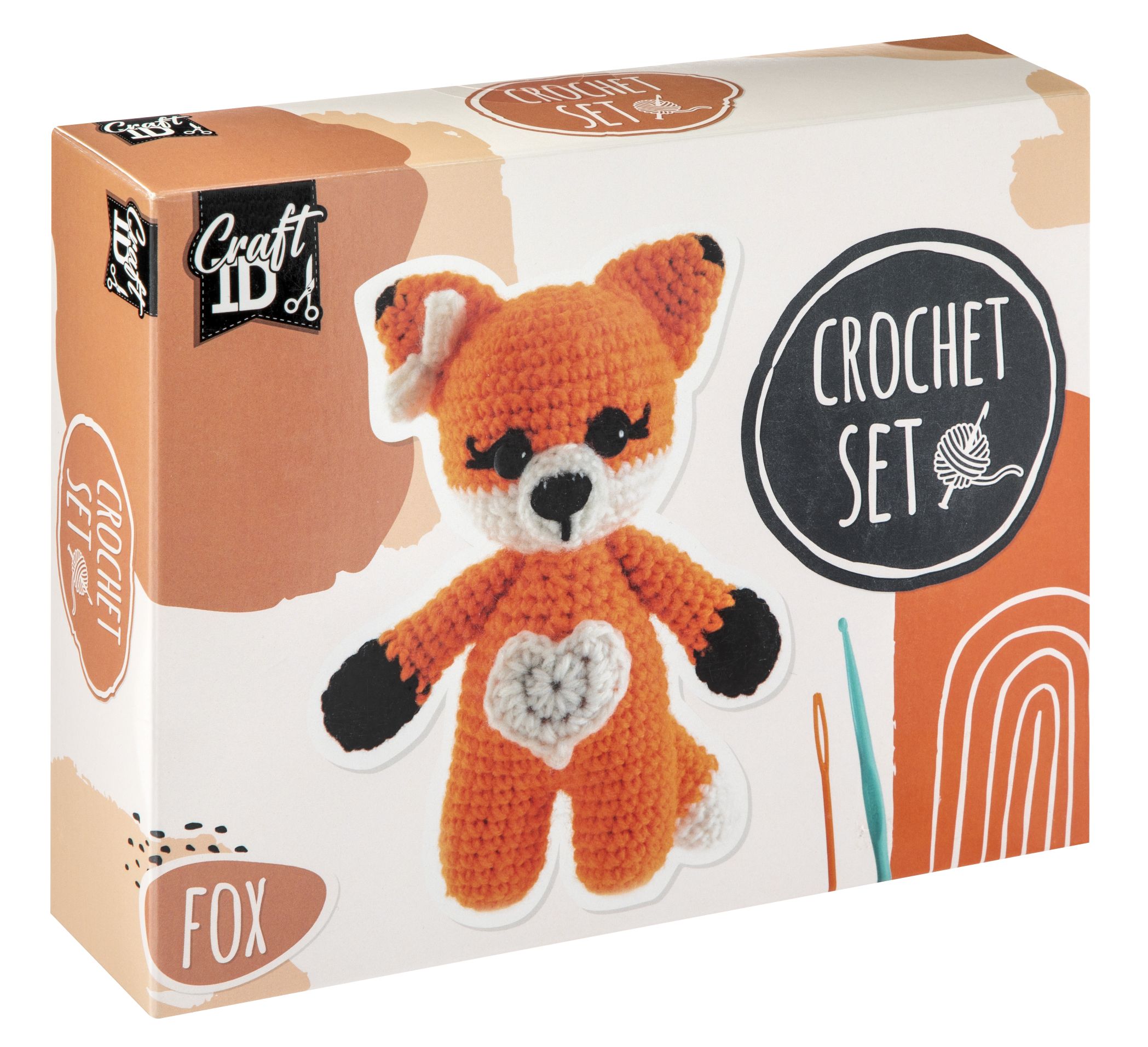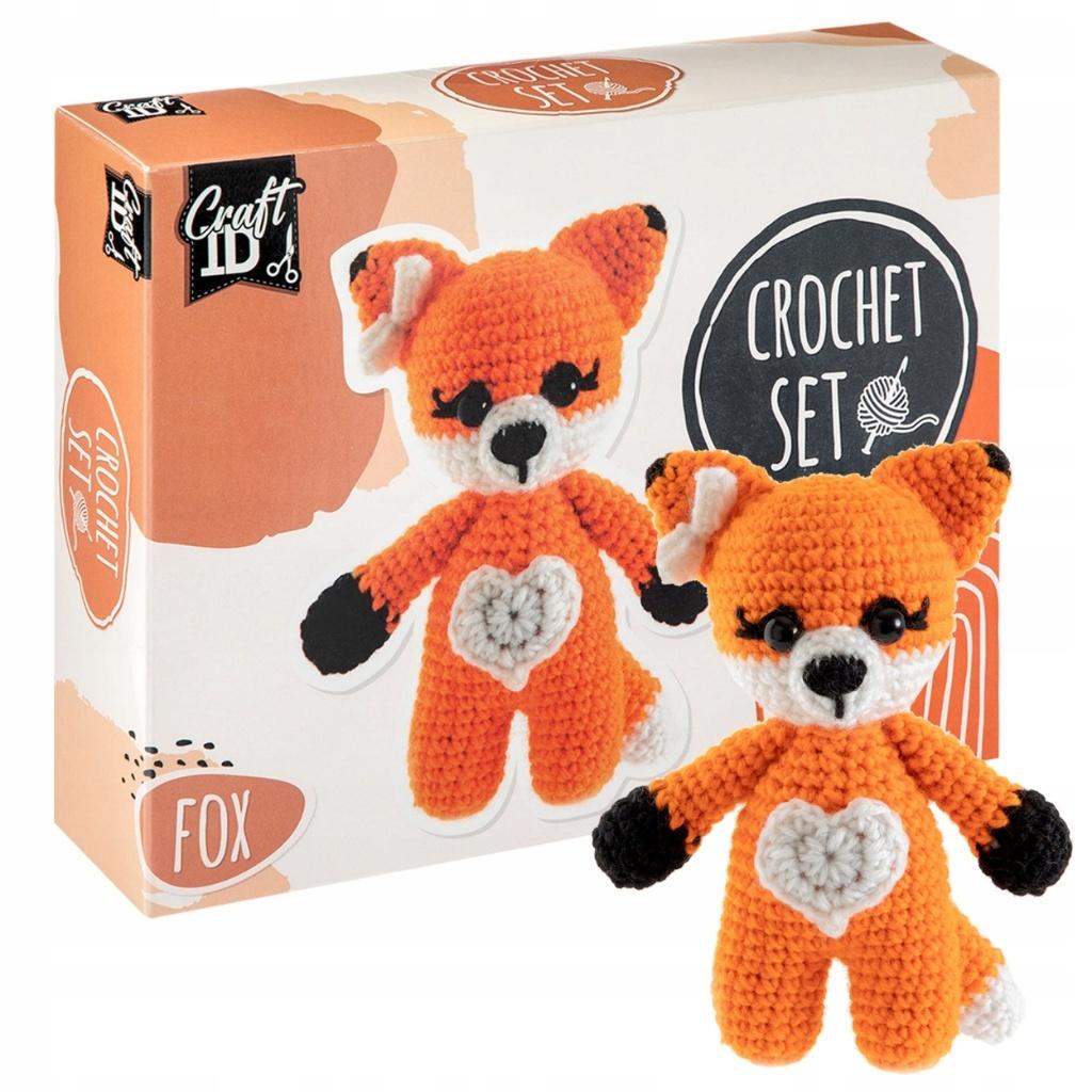 Zestaw do szydełkowania. Lisek 13 x 8,5 x 17cm. Zestaw zawiera: białą nić, pomarańczową nić,czarną nic, wypełnienie, plastikowe szydełko i oczka dla liska.
