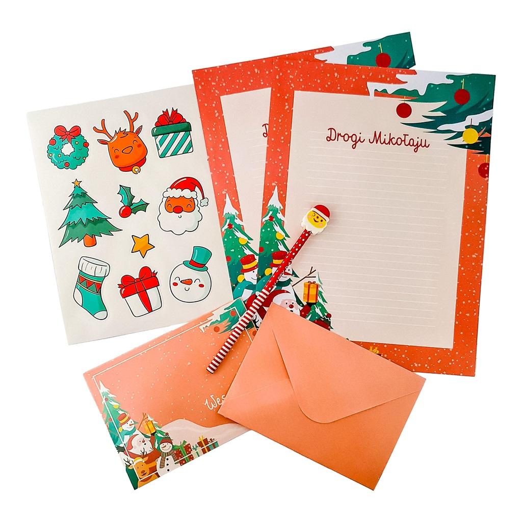 W skład zestawu wchodzą: 2 zadrukowane arkusze papieru do napisania listu, 2 zadrukowana koperty, zestaw naklejek, ołówek.