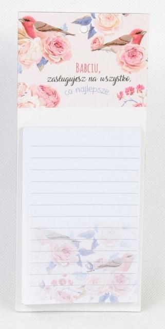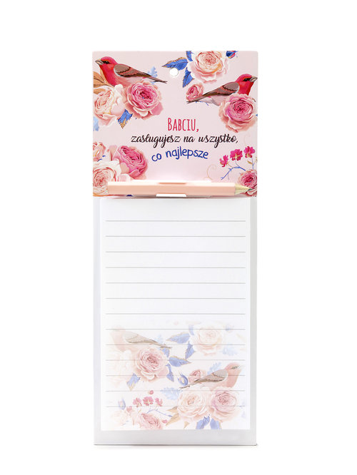 "*lista zakupowa z dedykacją ""Babciu, zasługujesz na wszystko co najlepsze"" *może służyć również jako lista rzeczy do zrobienia *posiada 40 kartek w linię,  o wymiarach 14 cm, 9 cm umieszczonych na kartonowej podkładce *możliwość przymocowania na lodówce, dzięki magnesom umieszczonym na podkładce *idealny prezent dla babci, nie tylko z okazji jej święta *wymiary całości: 24 cm, 10 cm"