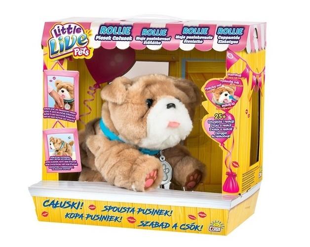Rollie Piesek Całusek to interaktywny piesek, który jest zawsze szczęśliwy gdy cię widzi. Bądź gotowa/y na całuski i przytulanki, kiedy tylko zaczniesz zabawę z Rollie, bo on uwielbia okazywać swoją miłość. Rollie porusza się i zachowuje jak prawdziwy szczeniaczek. Ma ponad 25 różnych dźwięków i reakcji. Gdy go głaszczesz po grzbiecie macha ogonkiem, a gdy pogłaszczesz go po główce zacznie wysuwać języczek. Rollie zasypia zamykając oczka i wydając dźwięki. Piesek ma specjalny certyfikat adopcji. Możesz mu nadać wybrane imię.