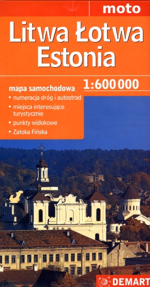 Mapa samochodowa Litwy, Łotwy i Estonii z numeracją dróg i kilometrażem. Zaznaczono Parki Narodowe, miejsca atrakcyjne turystycznie. Dodatkowo plany miast:Ryga, Wilno, Talin.
