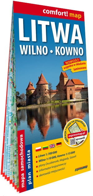 Litwa, Wilno, Kowno Dostojna wileńska katedra, wspaniały zamek w Trokach, malownicze jeziora auksztockie, piaszczyste plaże Mierzei Kurońskiej, słynna Aleja Wolności w Kownie. Tym wszystkim kusi turystów Litwa. Jeszcze więcej ciekawych miejsc pomoże odnaleźć dwustronnie laminowana, wygodna w składaniu mapa samochodowo-turystyczna tego kraju. Publikacja zawiera ponadto: - turystyczne plany Wilna i Kowna wraz z obszernym informatorem o historii tych miast i ich najciekawszych obiektach, - plany i krótkie opisy Druskiennik, Kłajpedy i Szawli, - rzeczowe opisy pozostałych najciekawszych miejscowości Litwy: Birsztan, Kiejdan, Kierniowa, Naringi, Połągi, Rumszyszek, Trok i Kalwarii Żmudzkiej, - informacje o wszystkich litewskich parkach narodowych. Samochodowo-turystyczna mapa Litwy 1:700 000 - aktualny stan dróg, odcinki w budowie i projektowane, - szczegółowa kategoryzacja i numeracja dróg, - odległości drogowe w kilometrach, - bogata treść turystyczna, obiekty światowego dziedzictwa UNESCO, parki narodowe, lasy, - skorowidz miejscowości. Turystyczne plany Wilna 1:10 000 i Kowna 1:15 000 - plany interesujących dla turysty, centralnych dzielnic miast, - szczegółowe skale 1:10 000 (1 cm – 100 m) i 1:15 000 (1 cm – 150 m), - bogata treść turystyczna, m.in.: zabytki, muzea, hotele i inne istotne obiekty, - skorowidz ulic, - informator turystyczny.