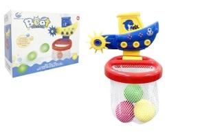 Zabawka łódka z koszem do kąpieli dla mniejszych dzieci. Wystarczy przymocować łódkę do ściany w łazience i podczas kąpieli cieszyć się zabawą. Zestaw zawiera: łódkę, kosz oraz 3 kolorowe piłeczki, którymi można trafiać do kosza podczas kąpieli. Zabawka rozwija u dziecka logiczne myślenie, poprawia koordynację ręka-oko. Produkt zapakowany w kartonowe opakowanie. Zabawka przeznaczona dla dzieci od 18 miesiąca życia.