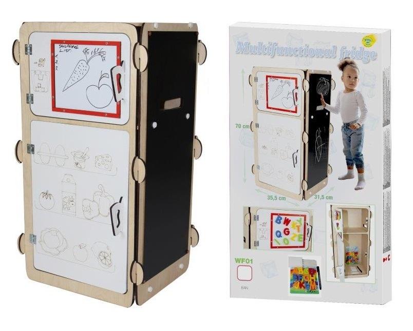DUŻA, drewniana naturalna lodówka! Zestaw zawiera lodówkę, magnetyczny notatnik suchościeralny, marker, literki magnetyczne, dużą tablicę kredową oraz zestaw kredy z gąbką. Całość jest spakowana w kolorowe opakowanie.