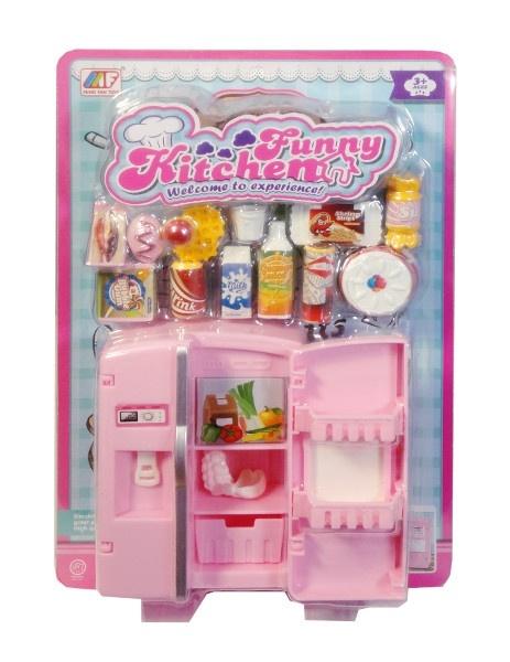 Kuchenne mebelki dla lalki lodówka. W środku znajdują się różne akcesoria : soki, mleko, ciasta, kubki. Zabawka dla dzieci od 3 lat. Produkt zapakowany w kartonową podstawkę z przezroczystym kloszem.