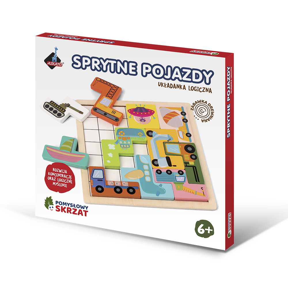 11 drewnianych elementów do ułożenia na drewnianej podkładce.