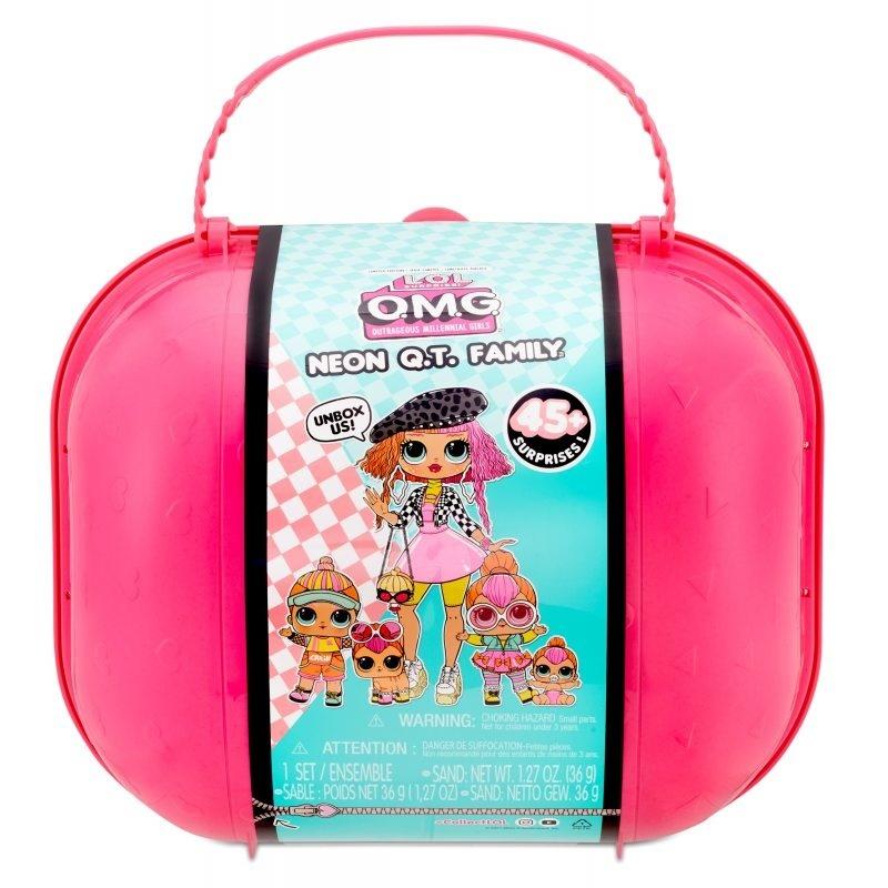 L.O.L. SURPRISE - LOL OMG Neon Q.T. Family 45 niespodzianek + 4 Lalki i Zwierzątko 423195 to ekskluzywny zestaw prezentowy, skrywający w sobie aż 4 lalki, zwierzątko i ponad 45 niespodzianek do odkrycia! Zapakowane w różową walizeczkę z wytłoczonymi serduszkami i trójkątami niespodzianki, zachwycą każdą dziewczynkę. Rodzinka to śliczna lalka fashion O.M.G. - Neonlicious, laleczki dziewczynka i chłopiec L.O.L. Surprise: Neon Q.T. i Neon Guy, a także zwierzątko Neon Kitty i siostrzyczka Lil Sister - LIL Neon Q.T. Śliczne, stylowe stroje, a także fantastyczne akcesoria sprawią, że dzieci czeka mnóstwo radości nie tylko podczas rozpakowywania, ale także w trakcie zabawy. Zestaw to świetna inspiracja do odgrywania ról, stylizacji i przebieranek. To doskonała propozycja na wyjątkową okazję, np. święta, czy urodziny.