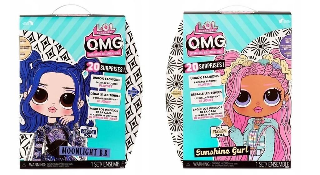 Modne lalki LOL Surprise OMG z serii Core Doll 4.5. W każdym kartonie po 2 lalki - Sunshine i Moonlight B.B.. Poszczególne opakowania zawierają 1 dużą lalkę LOL o wysokości 24 cm, a ponadto 20 niespodzianek, w tym buty, ubrania i inne akcesoria. Opakowanie lalki LOL staje się garderobą do przebierania dla laleczki. Produkt przeznaczony dla dzieci powyżej 3. roku życia.