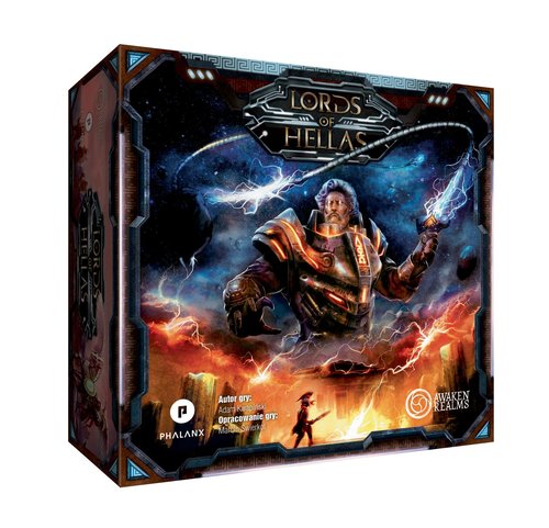 Wraz z upadkiem cywilizacji mykeńskiej potęga i kultura starożytnej Grecji odeszła w niebyt, zaś Hellada pogrążyła się w chaosie i zniszczeniu. Ten mroczny okres nie został udokumentowany w żadnych kronikach. Pośród śmierci i zamętu kilkoro wybrańców postanowiło przywrócić prawo i porządek przejmując kontrolę nad upadłą krainą. Do historii przeszli jako bohaterowie, ale wkrótce nad ich ambicjami zapanowała żądza władzy. Pomiędzy wybrańcami rozpętała się gwałtowna wojna, której zwycięzca miał zostać niepodzielnym władcą Hellady. Trwająca wojna przyciągnęła uwagę tajemniczych i zaawansowanych technicznie istot, które przybyły do tego świata. Zaproponowały swoje wsparcie bohaterom, zapewniając im potężną broń o straszliwej mocy. Wkrótce Grecy zaczęli czcić te istoty jako bogów. Czy zdołasz przetrwać w tej nieprzyjaznej krainie gnębionej przez potwory i ciągłe konflikty? Czy jesteś gotów do walki, by stać się Władcą Hellady? W grze Lords of Hellas kierujesz poczynaniami jednego z bohaterów. Mając do dyspozycji swoje armie, muszą pokonać wrogich herosów oraz zabić przerażające potwory, aby w ten sposób zadowolić nowych bogów. Autor: Adam Kwapiński Liczba graczy: 1-6 Wiek: od 13 lat Elementy gry: -Mapa; -4 plansze bohaterów; -4 plansze armii; -4 plastikowe pierścienie w kolorach graczy; -4 arkusze pomocy; -1 arkusz perskiej inwazji; -7 arkuszy potworów. Karty: -Talia wydarzeń (14 kart potworów, 9 kart zadań); -Talia ataku potworów (18 kart); -Talia artefaktów (10 kart neutralnych artefaktów, 7 kart artefaktów z potworów, 3 karty boskich artefaktów); -Talia kart walki (30 kart); -Karty błogosławieństw (12 kart Ateny, 12 kart Zeusa, 12 kart Hermesa) ; -Karty świątyń (5 kart); -Karty pomocy (4 karty); -Karta aktywacji monumentu (1 karta). Figurki: -4 herosów (Herakles, Perseusz, Achilles, Helena); -3 pięcioelementowe monumenty (Zeus, Atena, Hermes); -60 hoplitów (15 na gracza); -16 kapłanów (4 na gracza); -7 potworów; -Kość potworów. Żetony: -60 żetonów kontroli (15 na gracza); -12 żetonów cech (3 na gracza); -9 żetonów zadań; -8 żetonów świątyń (z plastikowymi podstawkami); -24 żetony wykorzystanych akcji (6 na gracza); -5 żetonów chwały (1 w kolorze każdej krainy); -15 znaczników ran potworów; -1 żeton Wyroczni Delfickiej (z plastikową podstawką).