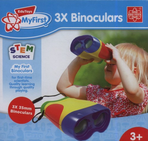 Plastikowa lornetka dla dzieci, z trzykrotnym powiększeniem. Nie posiada regulacji ostrości. Dla dzieci w wieku od 3 lat