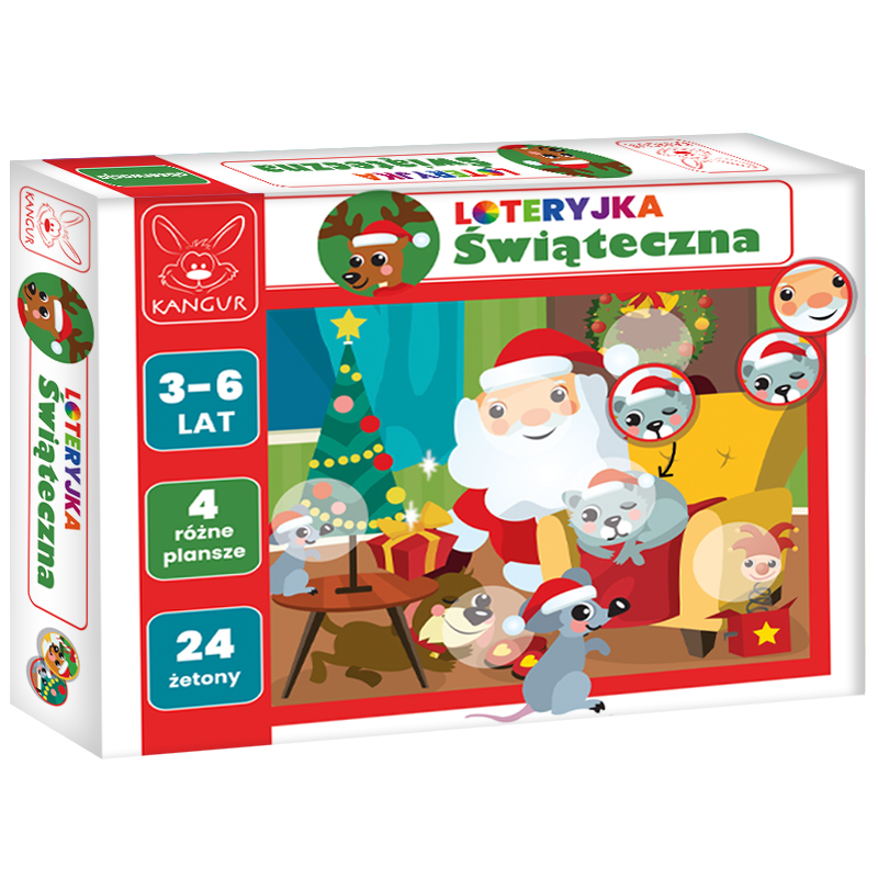Loteryjka świąteczna - odkryjmy razem magię świąt! Jedna z pierwszych gier proponowanych dla dzieci w wieku od 3 lat. Gra zawiera cztery kolorowe ilustracje oraz przygotowane do ilustracji 24 kolorowe żetony. Maluchy układają żetony na świątecznych planszach. Dziecko znajduje odpowiednie miejsce dla żetonu i widzi cała ilustrację.