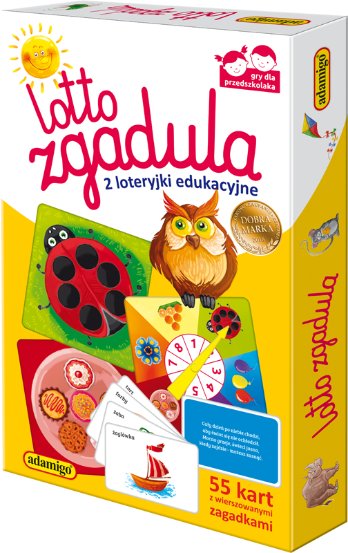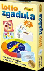 Gra oparta na ogólnie znanych zasadach loteryjki, usprawnia procesy kojarzenia obrazu z tekstem mówionym, wyrabia koncentrację dziecka, doskonali jego analizę wzrokową i wyzwala pozytywne emocje. Na podstawie zestawu gracze mogą wymyślać inne zabawy. Wrzeszczy cała rozbrykana! Skacze, biega, zje banana! My też mamy po niej spadek, bo to nasz pra, pra, dziadek. Takie i inne zagadki znajdują się w wierszowanej loteryjce „Lotto zgadula”. Zestaw gry zawiera: - koło losujące z ruchomą wskazówką, - 75 kart z zagadkami, - 45 żetonów oraz 6 plansz. Wiek graczy: 4+ Liczba graczy: 2-6