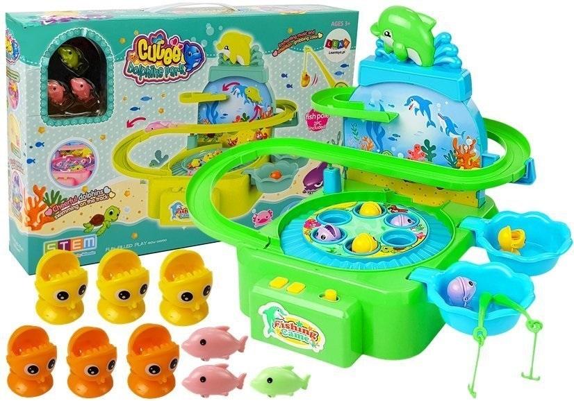 Zestaw do Łowienia Rybek Zielony Łowienie rybek jest świetną grą dla całej rodziny. Pamiętajcie, tylko by się skupić, ponieważ rybki są sprytne i nie zawsze dadzą się złapać na haczyk. Zręcznościowa gra rodzinna dostarczy mnóstwo uśmiechu i radości, a przy tym poprawi refleks i koncentrację wszystkich zawodników. Jesteśmy pewni, że ta klasyczna gra wywoła wiele emocji, a także nauczy dzieci zasad zdrowej rywalizacji. Zestaw wykonany w kolorze niebieskim. Dodatkową zaletą zestawu są efekty dźwiękowe. Bardzo łatwy montaż gry. Dla utrudnienia łowisko się kręci. Zasady gry są bardzo proste. By ją rozpocząć, należy umieścić baterie w podstawie do gry, a następnie ułożyć wszystkie zwierzątka w odpowiednim miejscu na łowisku. Wędki w dłoń i gotowe! Kolorowe kaczuszki i rybki kręcą się, zamykając i otwierając swe buźki. Zadaniem dwóch zawodników rywalizujących ze sobą jest sprytne wycelowanie i złapanie rybek na wędki czy w siatę. Wygrywa ten z graczy, który złowi większą ilość rybek. Z zabawki może korzystać samo dziecko, jednak gra będzie zdecydowanie weselsza, kiedy dołączy się rodzeństwo lub kolega. Elementy zestawu: - podstawa do gry - łowisko - tło do złożenia - elementy do zjeżdżalni - 2 akwaria - 3 delfiny - 3 kaczki - 6 rybek - zestaw naklejek - 2 wędki Wymiary opakowania: 41 cm x 26.5 cm x 8 cm Ze względu na małe elementy znajdujące się w grze, zabawka przeznaczona jest dla dzieci powyżej 3. roku życia. Zabawki posiadają certyfikat CE i są zgodne z normą EN 71. By uruchomić zabawkę, należy użyć trzech sztuk baterii "AA" 1.5 V, które nie są dołączone do zestawu. Zabawka jest prosta w montażu i obsłudze.