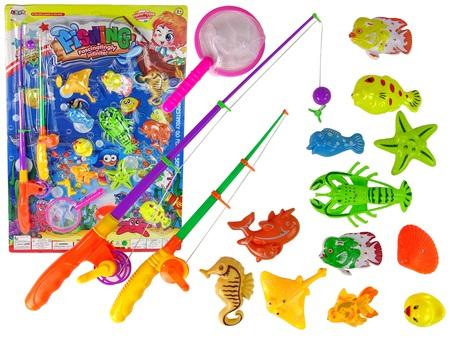 Gra Łowienie Rybek Zestaw Rybki + Wędka Fishing Game Zestaw do Łowienia Rybek Dwie Wędki Łowienie Rybek jest świetną grą dla całej rodziny. Zabawa poprawi refleks i koncentrację. Mały rybak może łowić rybki nawet we własnej wannie, a nawet podczas kąpieli. Twoje dziecko może także urządzić także zawody z rówieśnikami np. łowić na czas lub na punkty, ćwicząc przy tym koordynację i cierpliwość. Wykonanie charakteryzuje się wysoką starannością i wykonaniem, wykonane z nietoksycznego materiału. W zestawie znajdują się dwie wędki i 11 rybek oraz innych morskich stworzeń. Wędki mają zamontowany kołowrotek, którym opuszcza się lub podnosi linkę, na końcu zamontowany jest magnes, na który łapie się rybki. Wymaga to nie lada precyzji od małego wędkarza. W zestawie znajdziemy również siatkę na ryby, do której możemy włożyć złowione okazy. Wymiary opakowania: 62 cm x 63 cm x 6 cm Zabawka przeznaczona dla dzieci powyżej 3 roku życia.