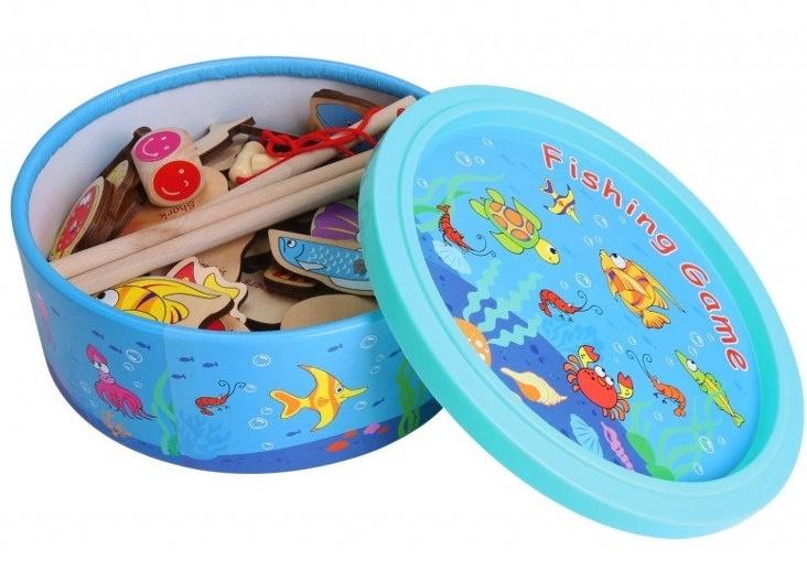 Gra magnetyczna Łowienie rybek firmy Top Bright Produkt jest zapakowany w funkcjonalne pudełko, które z jednej strony spełnia funkcję przechowywania z drugiej jest ważnym elementem zabawy w łowienie rybek. Zabawka wykonana jest z drewna. Wiek 3+