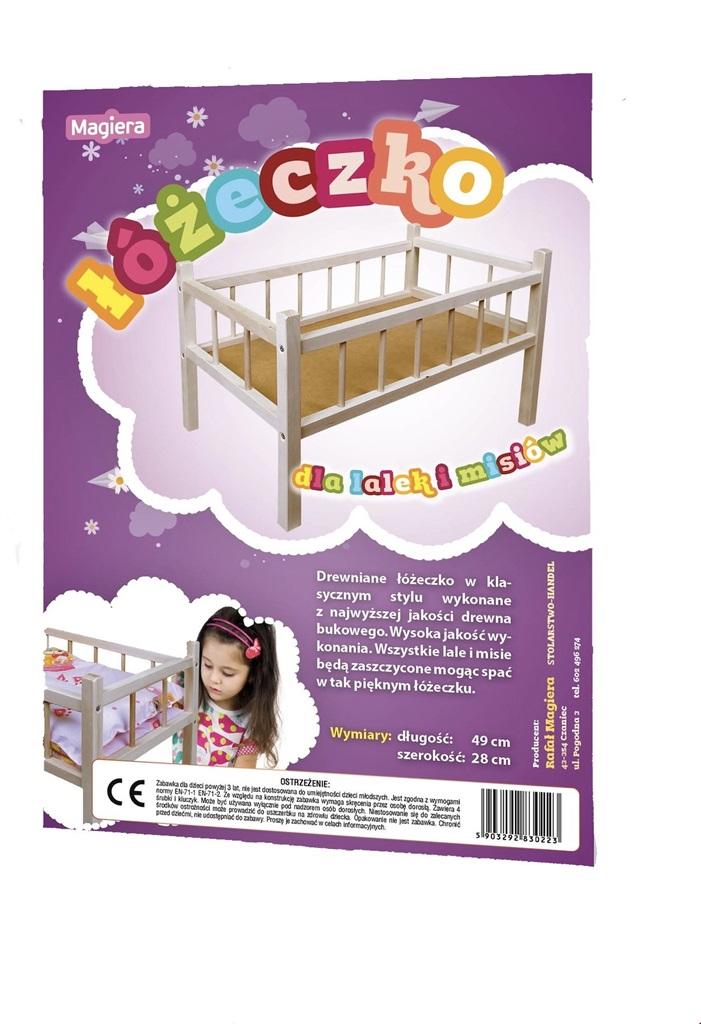Drewniane łóżeczko w klasycznym stylu, wykonane z najwyższej jakości drewna bukowego. Naturalne drewno nie tylko prezentuje się elegancko , ale jest również przyjazne dla środowiska. Polecamy nasz produkt, który łączy w sobie wysoką jakość wykonania oraz efektowny wygląd. Produkt wysyłany jest w elementach przeznaczonych do samodzielnego montażu (8 śrub i kluczyk imbusowy jest w zestawie ) a jego złożenie jest wyjątkowo proste. Łóżeczko jest trwałe i wytrzymałe z solidnym spodem. W trosce o bezpieczeństwo wszystkie elementy zostały starannie wygładzone i zaokrąglone. Wymiary łóżeczka: długość 49cm, szerokość 28cm .