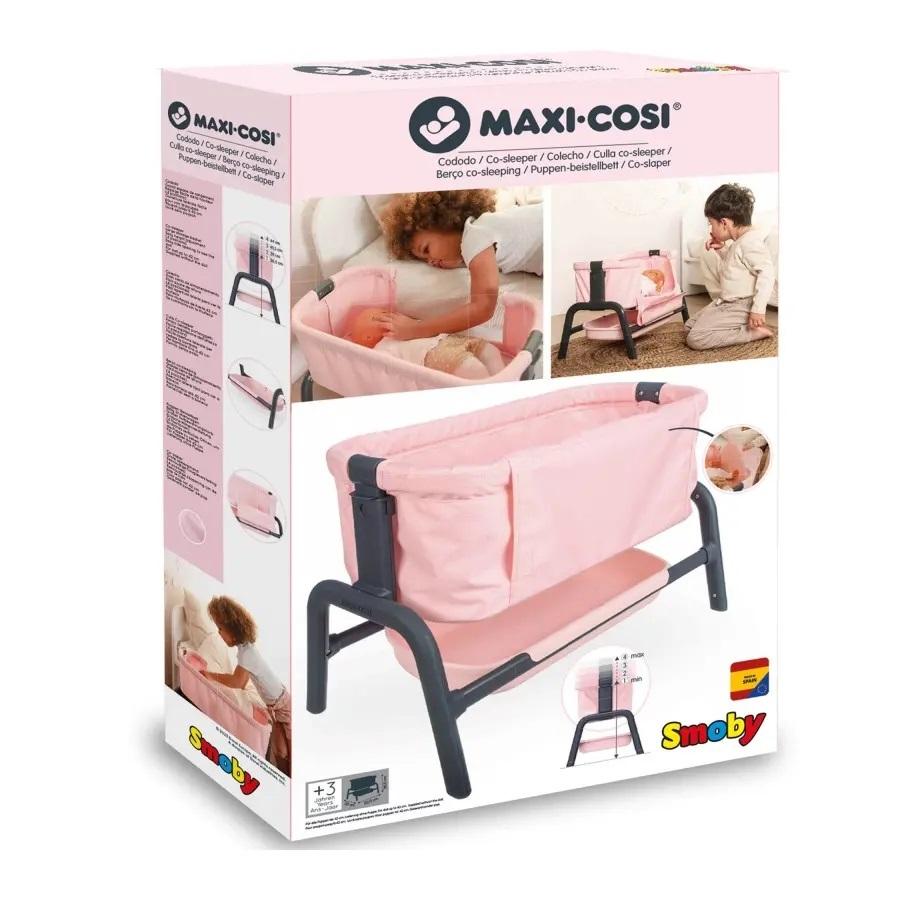 Łóżeczko dla lalki, które można ustawić obok łóżka dziecka, aby spało z lalką, dla zwiększenia realizmu opieki nad lalką. Pozycja do współspania może być dostosowna do wyskokości łóżka dziecka, dzięi 4 możliwym pozycjom. Pod łóżeczkiem znajduje się również półka do przechowywania akcesoriów. Dla laki do 38 cm (brak lalki w zestawie). Wyprodukowany w Hiszpanii.